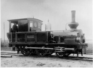 Till vänster ett lok, ”Trolle Ljungby”, tillverkat av Ljunggrens verkstad 1899. Till höger grupporträtt av snickeriverkstadens personal på Ljunggrens verkstad. Årtal okänt.